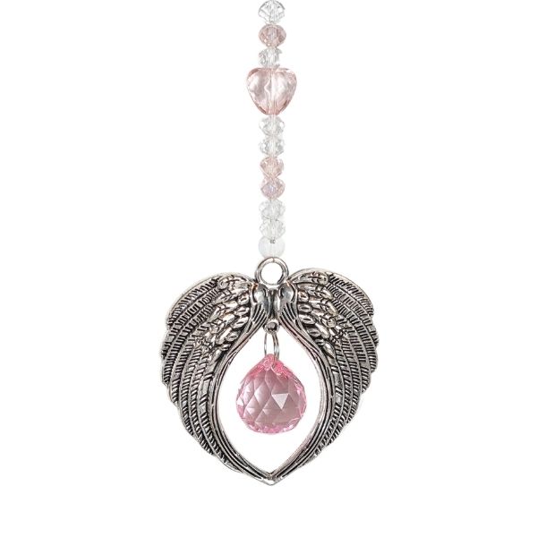 Hang this angel wings suncatcher near a sunny window and see a shower of rainbows around the room. Nestled between the wings is a pale pink acrylic drop to capture the light.