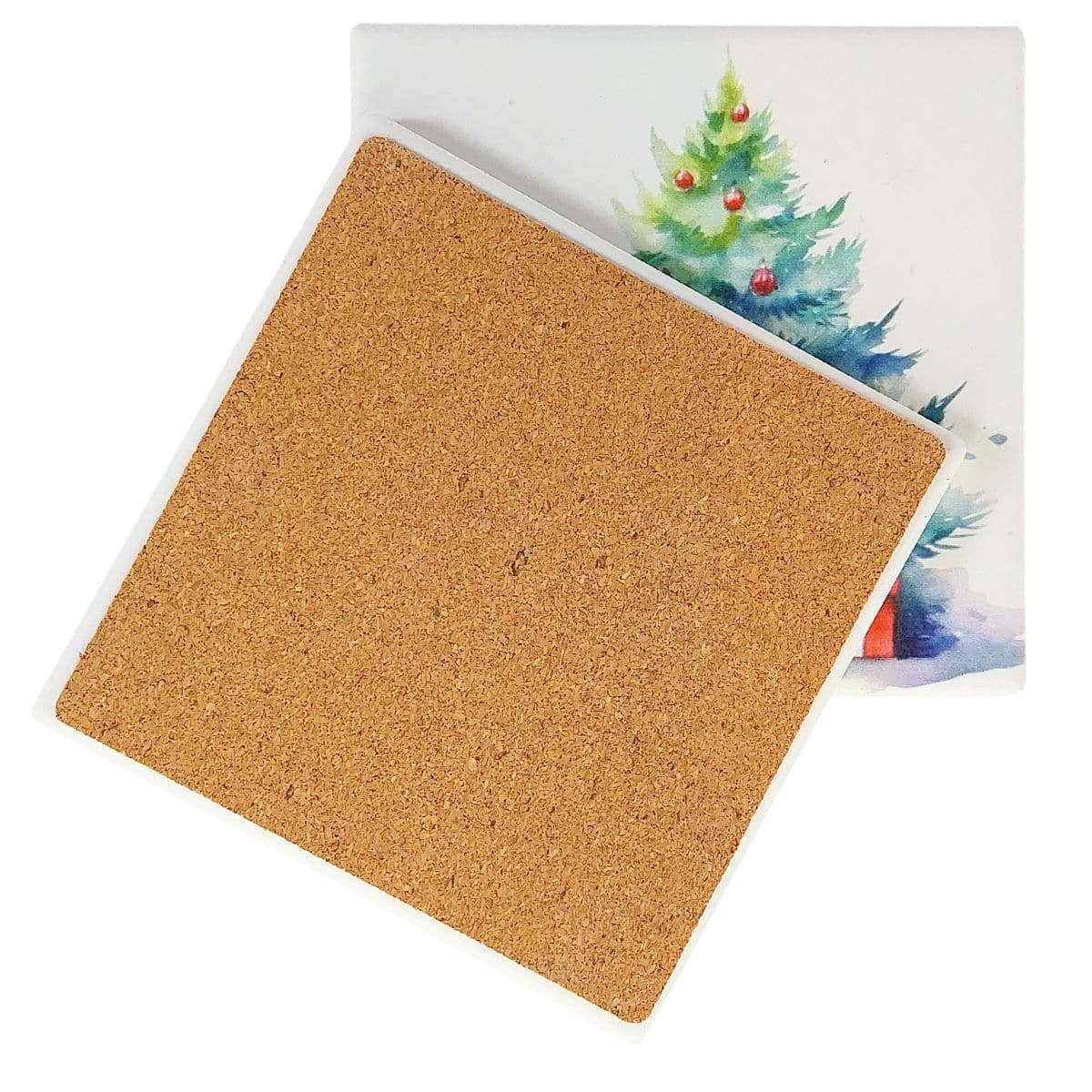 The design features a delightful watercolour Christmas tree adorned with red baubles and neatly wrapped presents underneath, evoking the magic and nostalgia of Christmas morning. Subtle brushstrokes and soft hues give this coaster a handcrafted charm, adding a joyful accent to your coffee table, dining area, or office desk.