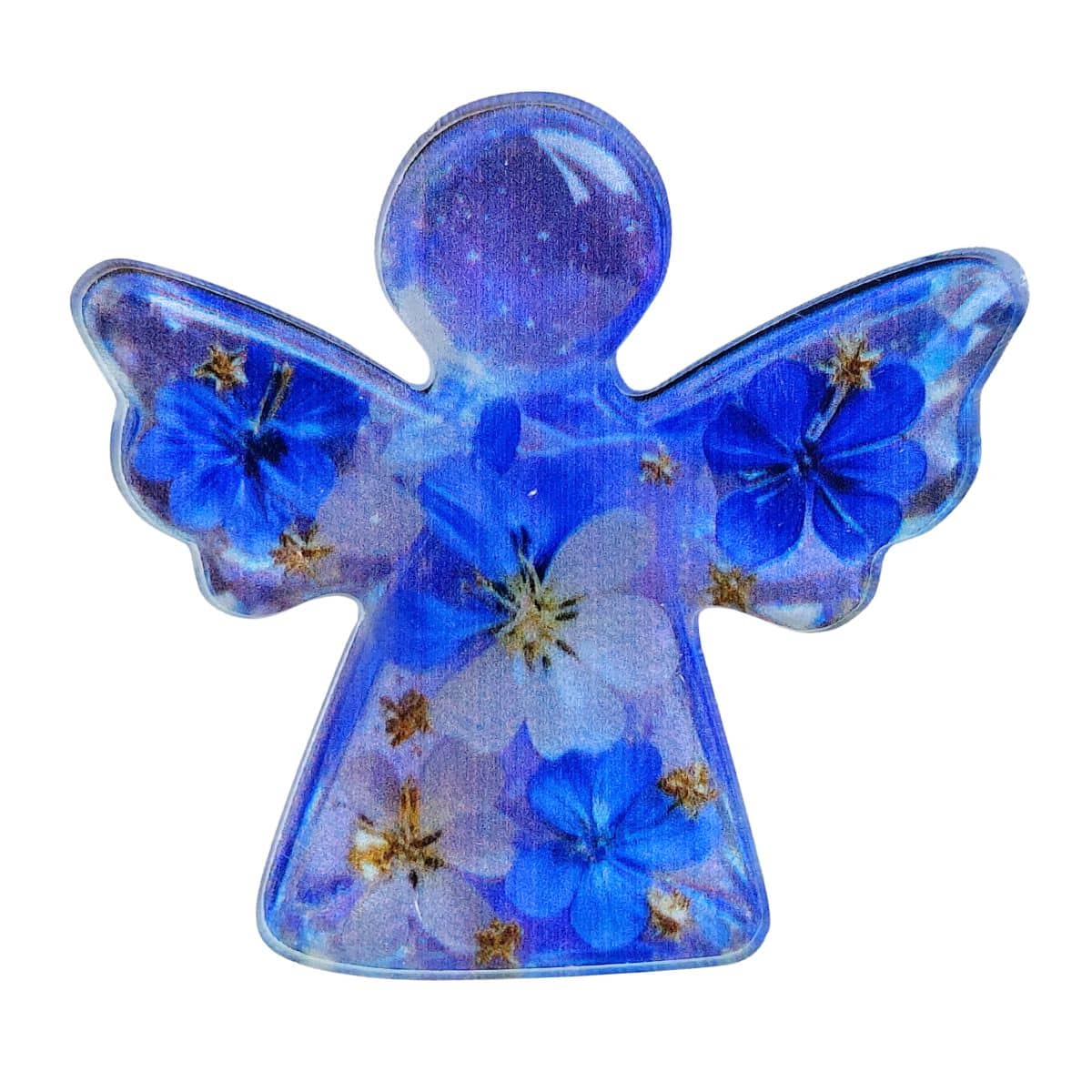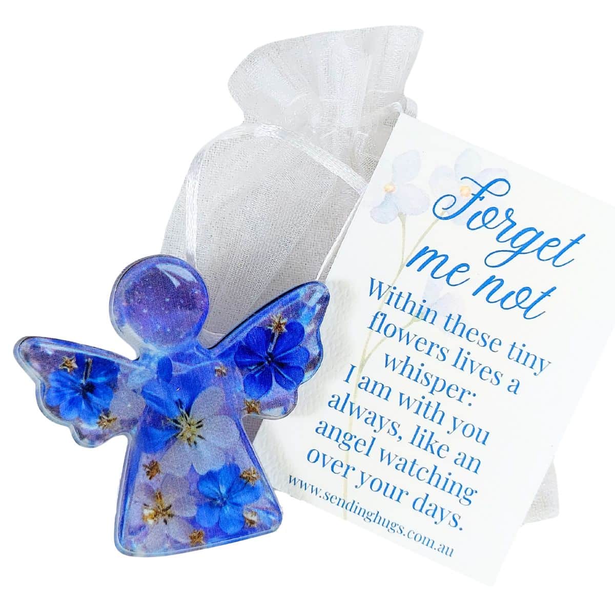 The angel is made from clear acrylic with individually unique forget-me-not flower designs, ensuring each token has its own special character.