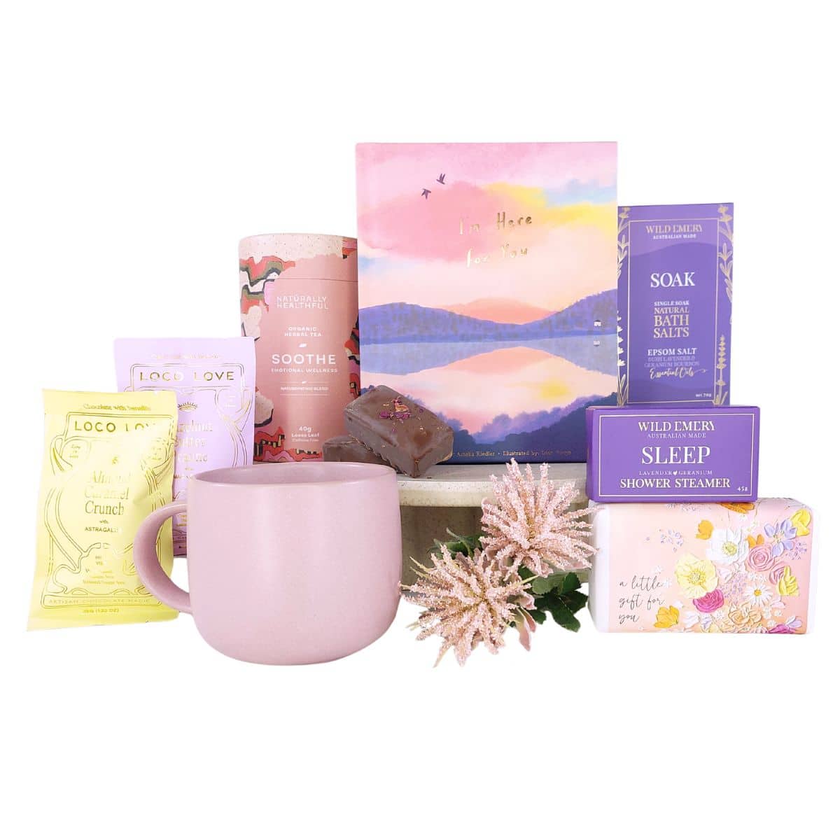 This hamper features several Australian-made items, including organic tea, bath salts, soap, sweet treats and a handmade shower steamer, ensuring both quality and meaningful local connection.