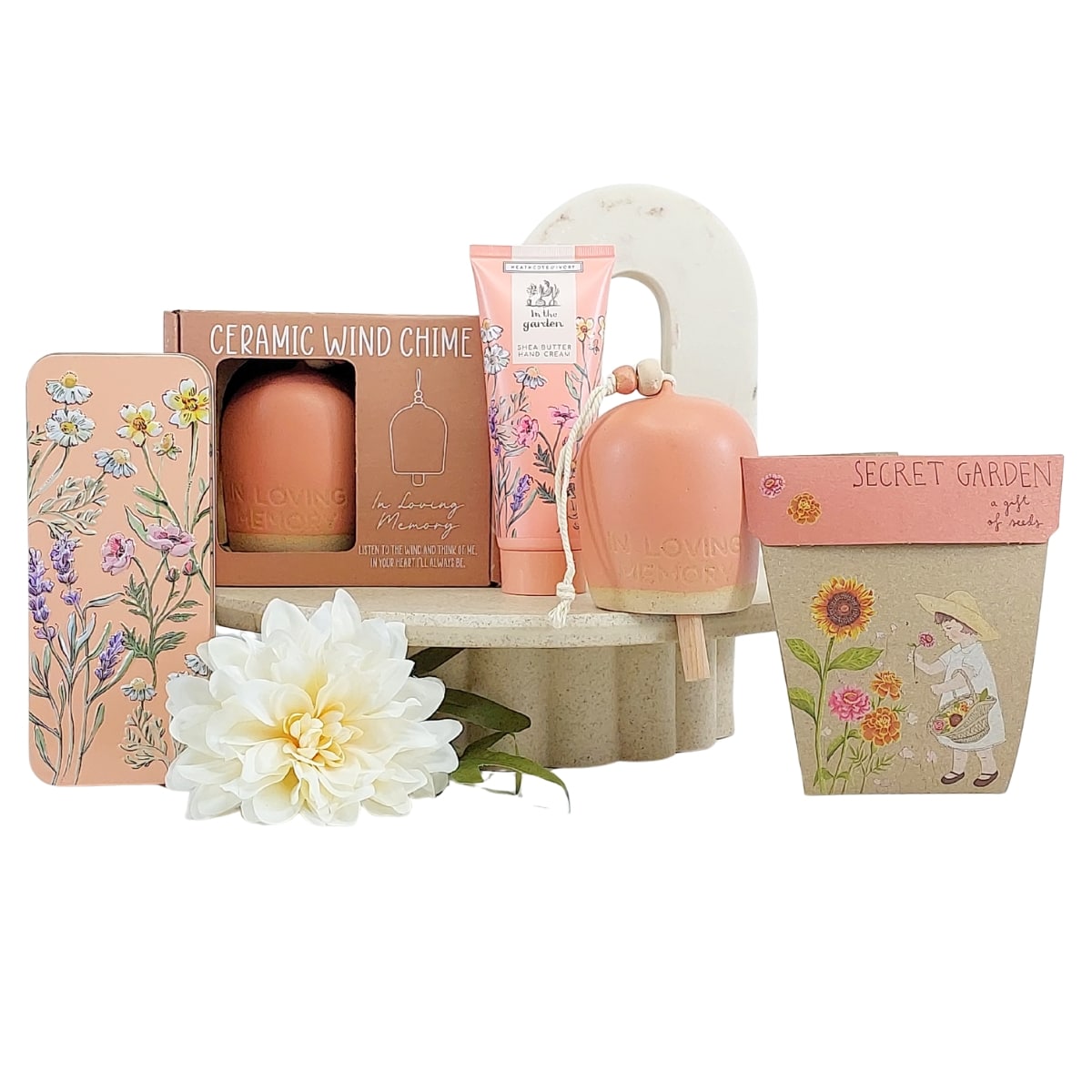 The In The Garden Comfort Box is a thoughtful sympathy gift designed to offer comfort, healing, and remembrance. With soothing keepsakes, self-care essentials, and symbolic items like wind chimes and seeds, it provides quiet moments of reflection and gentle support for someone grieving.