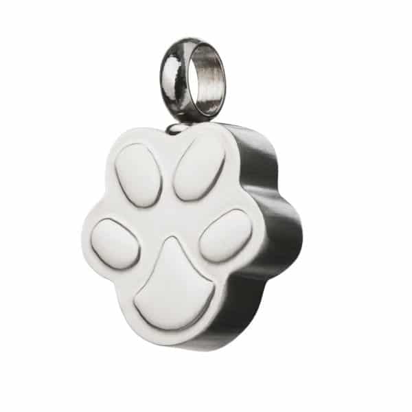 Small paw pendant. Made from stainless steel in the shape of a paw with raised pads.