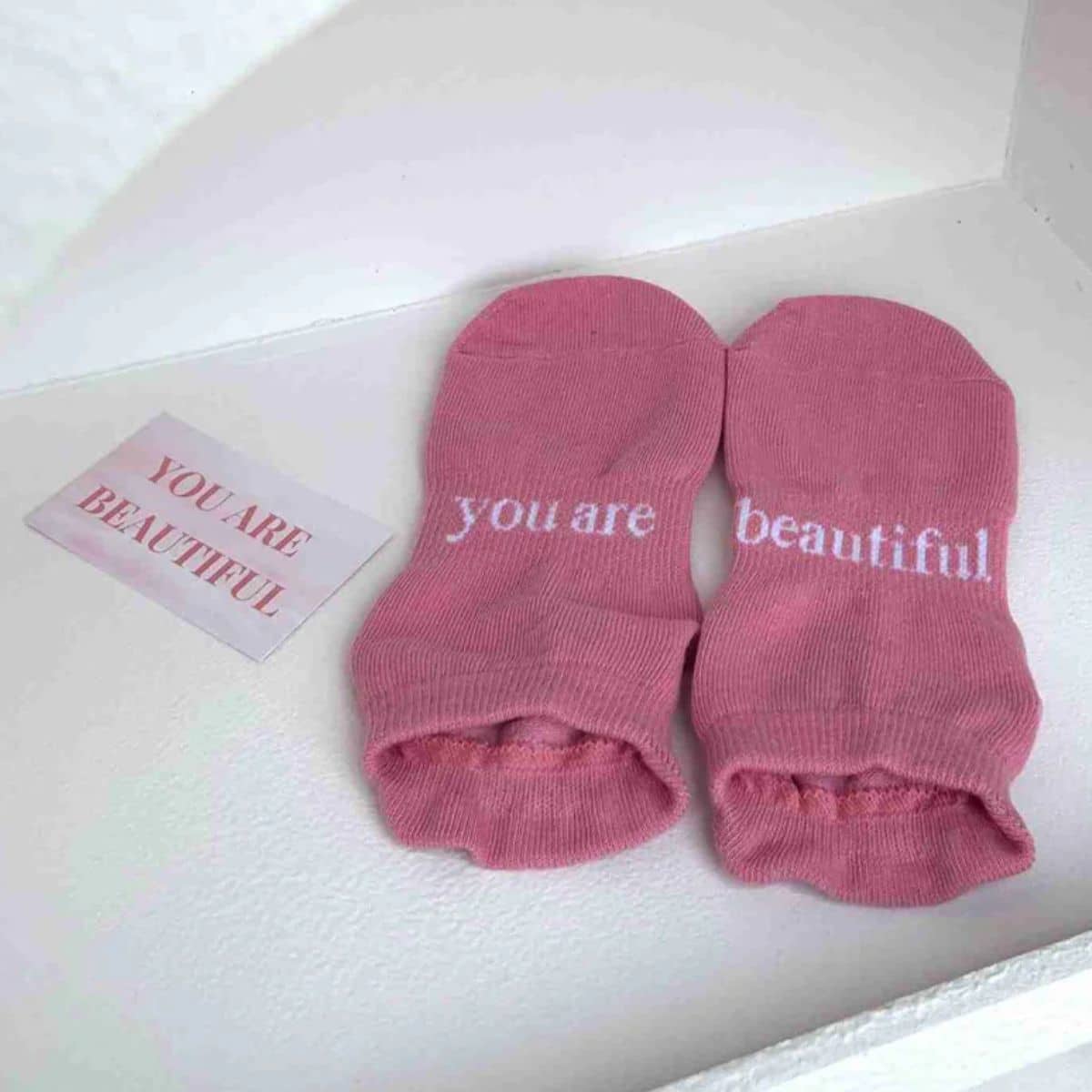 • Includes: Pair of pink socks and affirmation card